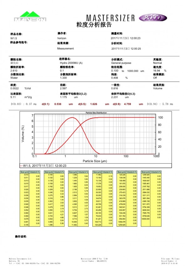 W1.5綠碳化硅微粉而脆的非金屬材料。其微粉還可用作陶瓷材料;純度高,能夠抗氧化、抗磨損和抗腐蝕,性能比較穩定,使用壽命比較長還廣泛用于耐火材料和各種磨具制造。